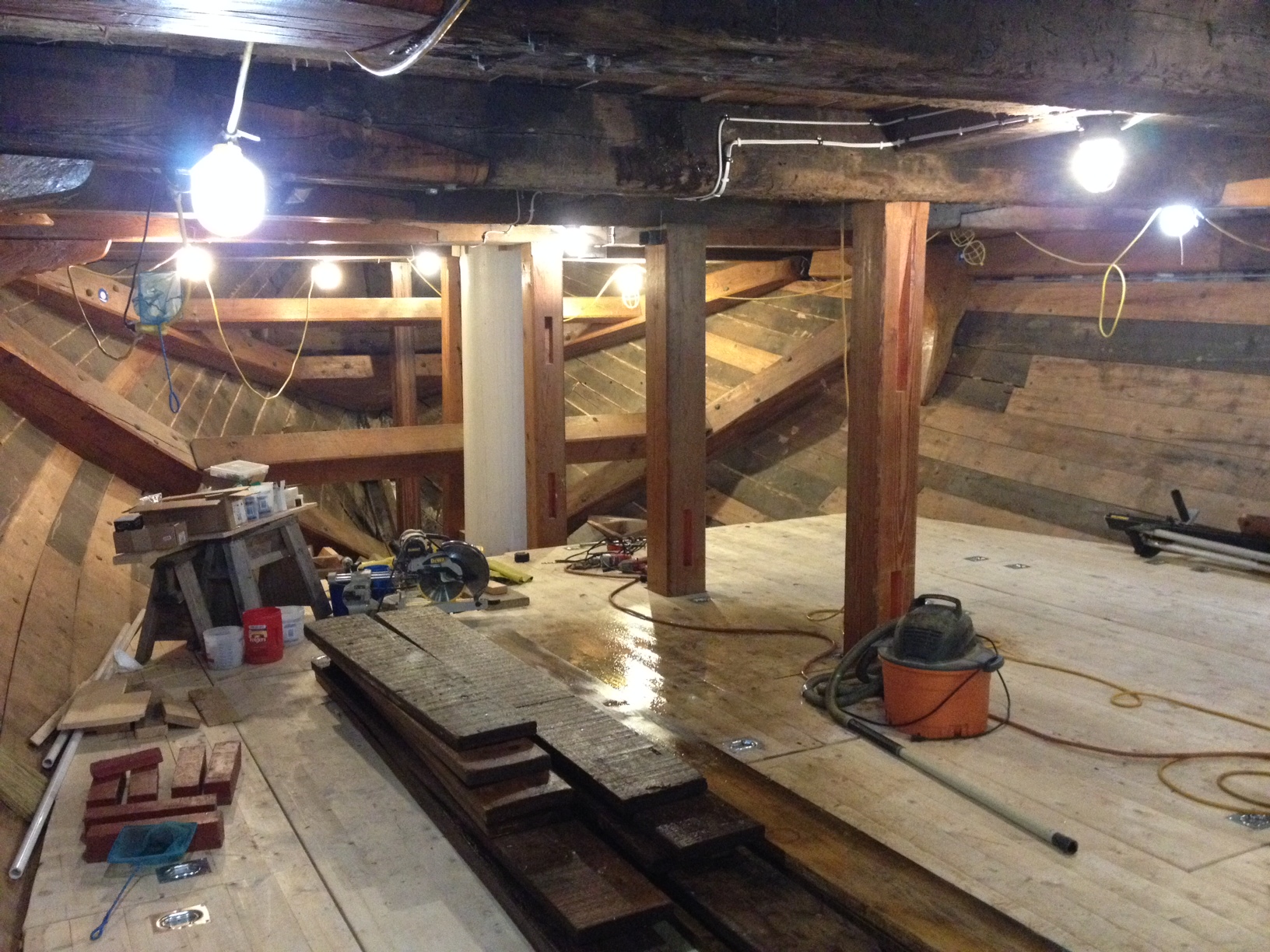 April 30th was a wet day. Somewhat cooler as well. I headed to Mystic Seaport with my friend, fellow voyager, and house guest Courtney Leonard (Shinnecock). We were attending an orientation with other voyagers for a day of introductions, information, and training for our upcoming voyages this summer. With some adjustment to the day’s schedule with hopes of avoiding rain, we headed to the docks. There, we rotated between rowing whaleboats and climbing the rigging of the training vessel Joseph Conrad. We did not avoid rain; rather became one with it. After this soggy experience (one I welcomed since every time I’ve been to the Seaport for this type of event, the weather has be perfect; here I learned more of what all mariners would have contended with regularly – less the rolling ocean!), we were broken up into three groups that alternated between touring the Charles W. Morgan, visiting the collections and research center, and discussing voyage logistics. Towards the end of the day, every soggy voyager convened in the Fishtown Chapel to meet with Seaport president Steve White and discuss the 38th Voyage. We learned just how much vision, planning, and care went into the restoration and voyage preparation for the Morgan. Great conversation and many laughs soon turned to thoughts of what will happen beyond this summer’s events. What will the future hold for all of us given the honor of sailing aboard the “lucky ship”? With cooling temperature came visible breath and final tour of the Morgan to show us our accommodations in the fo’c’sle. Before heading out for a drink with the others, Courtney and I collected quahog shells on the dock, broken by enterprising seagulls. The purple lip of the shell caught her eye. Wampum beads and other ornamentations made from the shell remain important to the region’s Native American communities and again reminded me of the enduring connection Indians in this area have had to the sea.