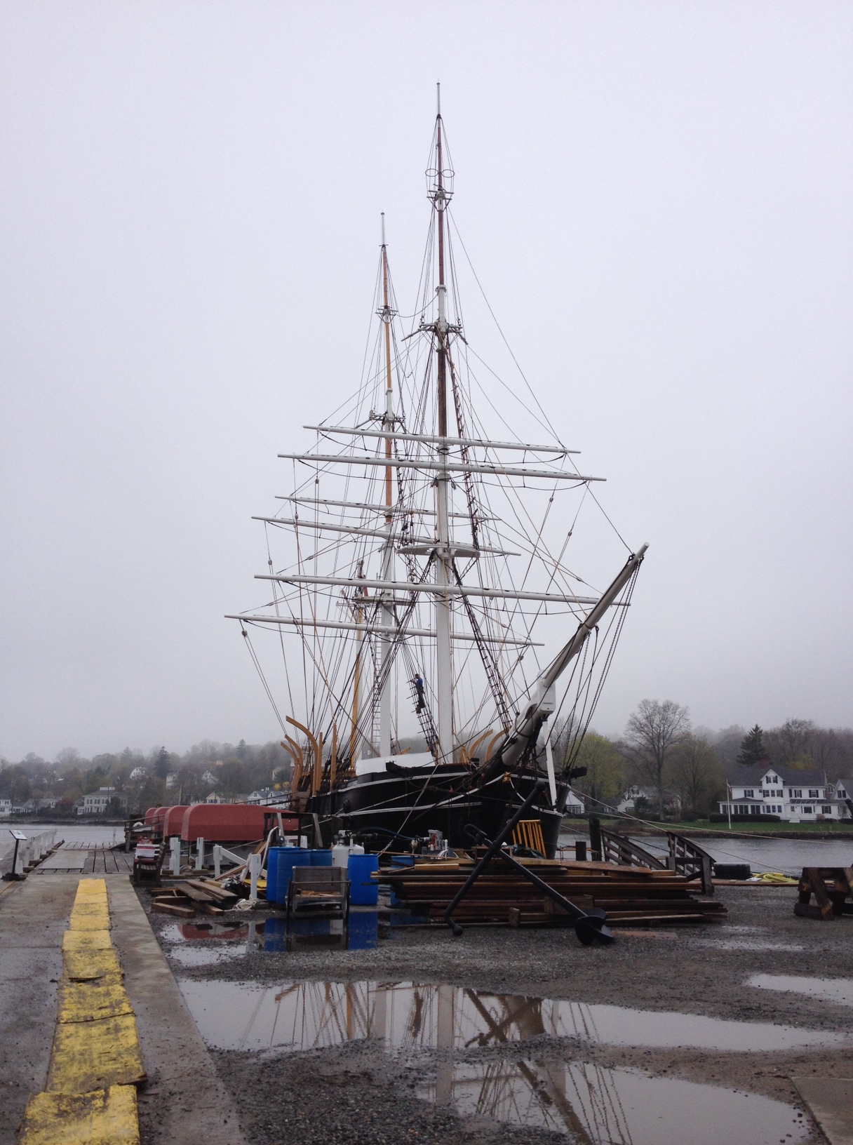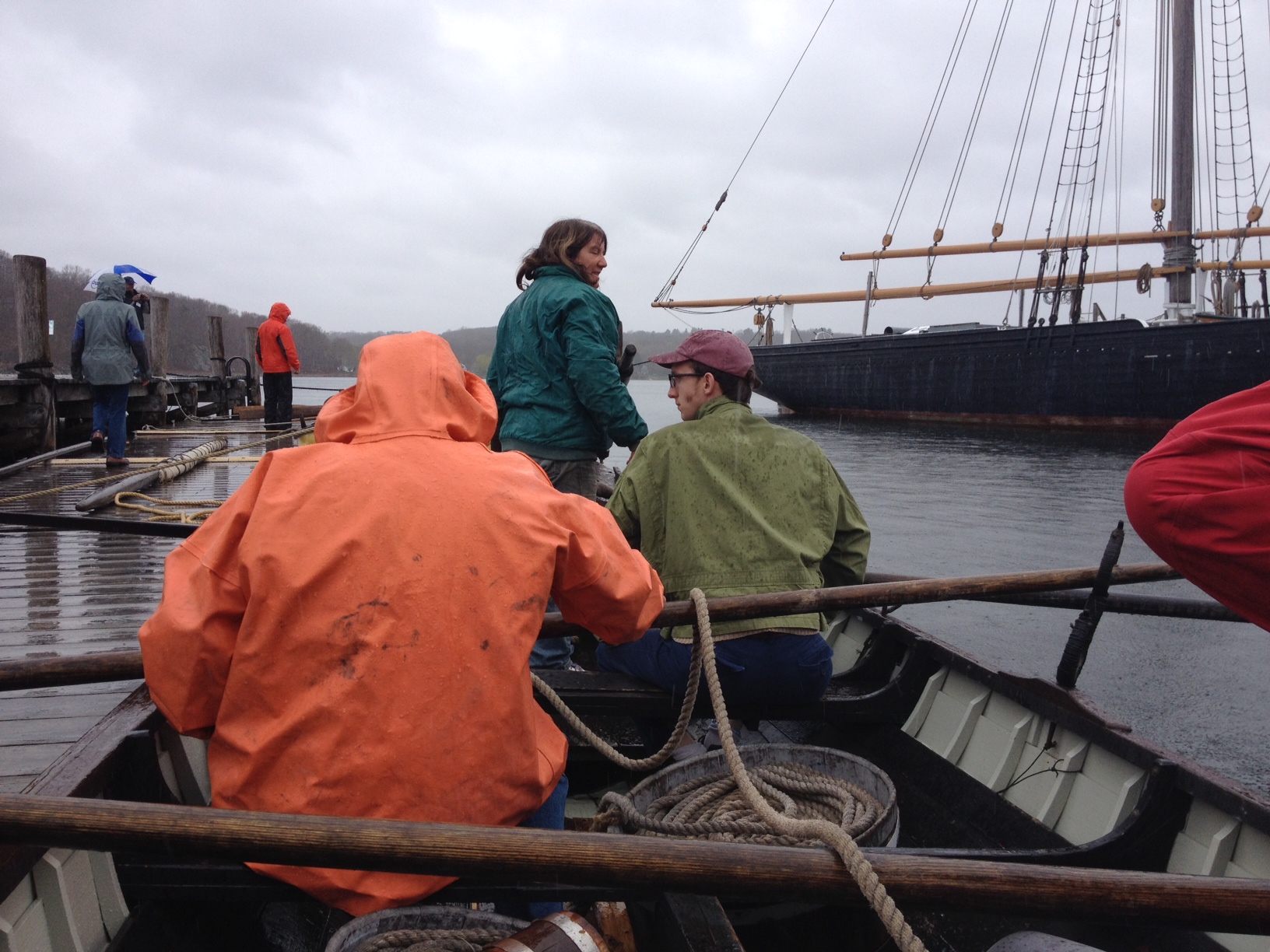 Ready to row whaleboats on the Mystic River in the poring rain. Training vessel Joseph Conrad in the background.