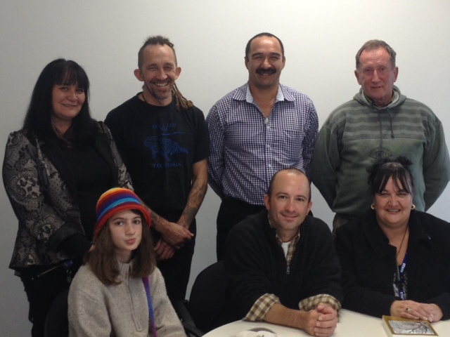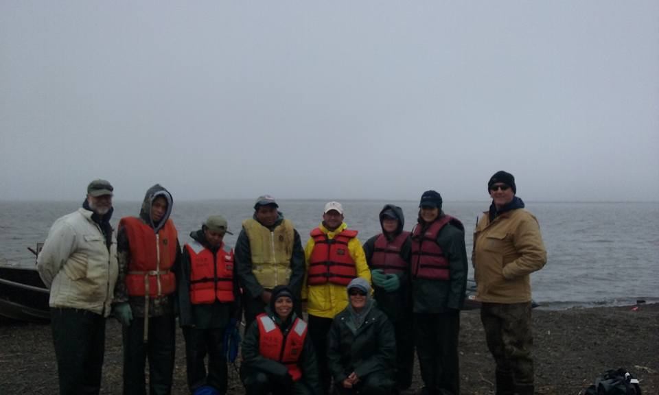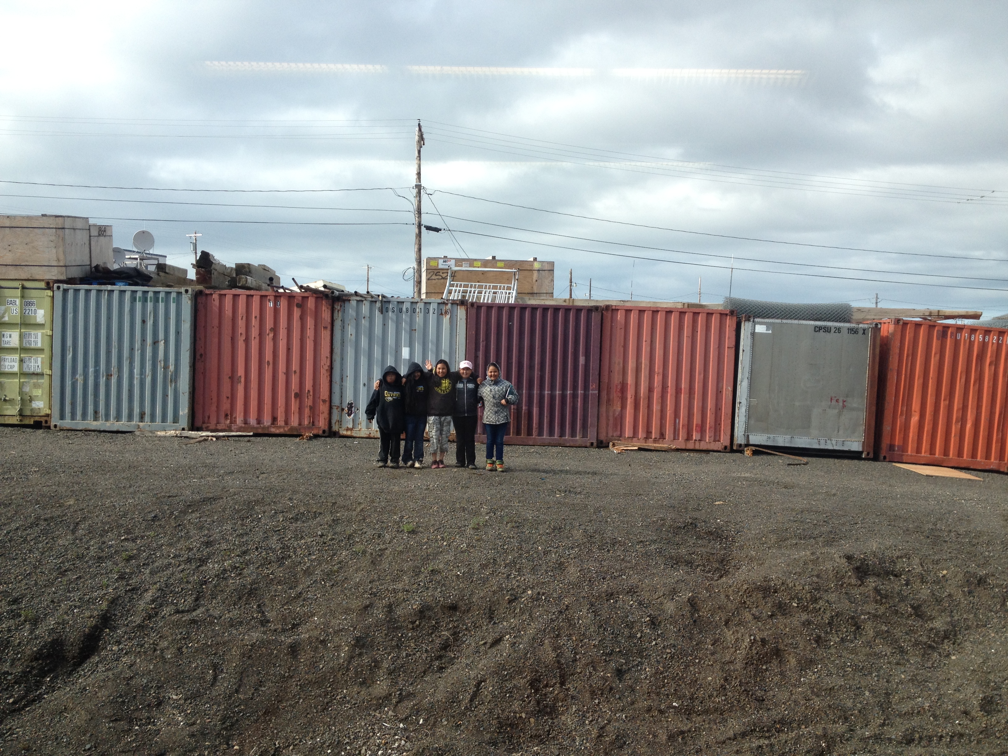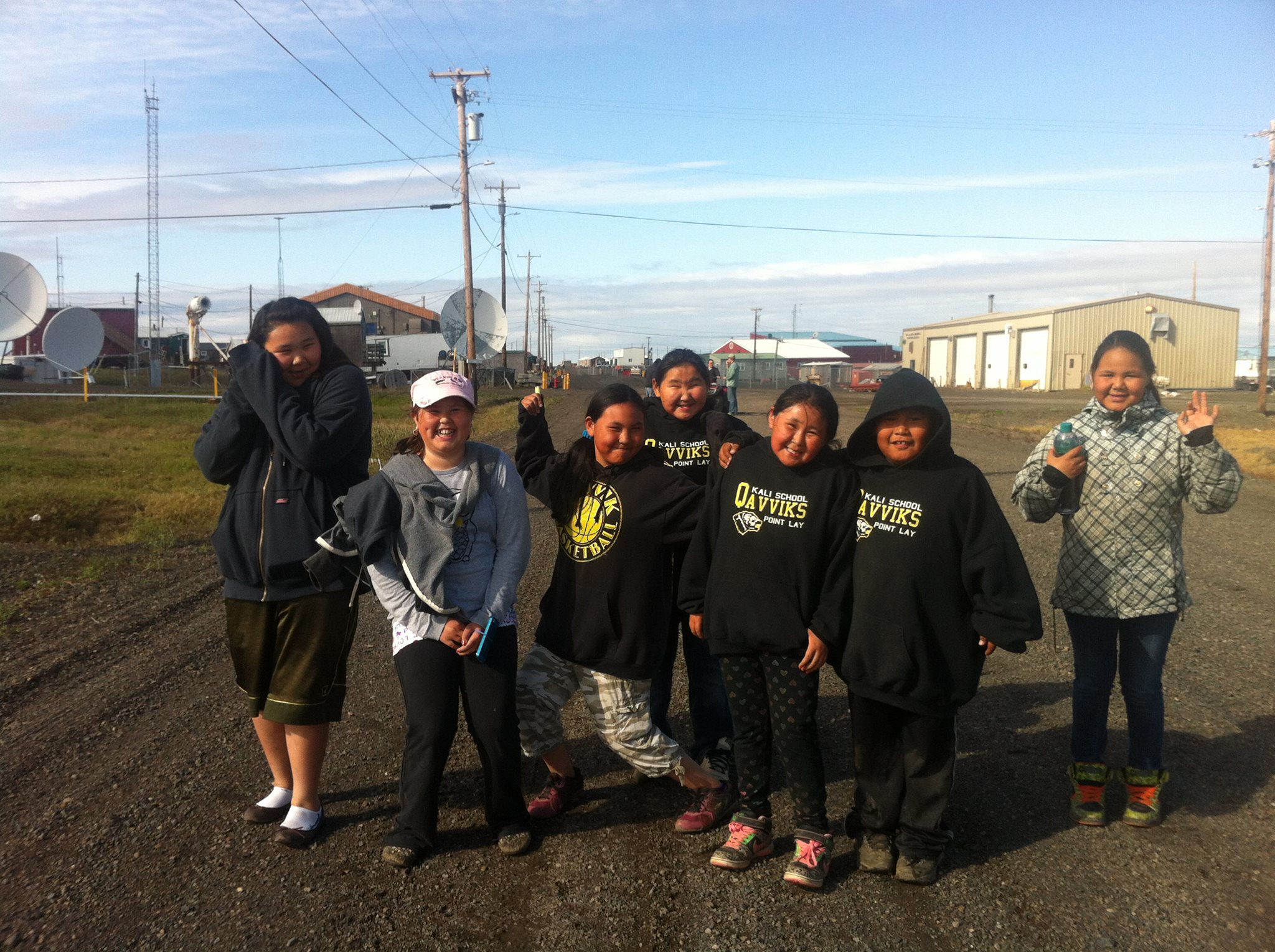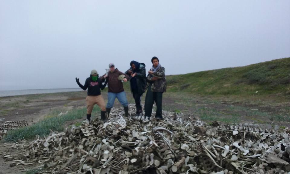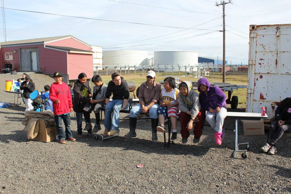 Group shot and photobombed by and anonymous Inupiat kid. l-r: C.J., Anthony, Crissy, Jason, Aakyia, anonymous, and D’Vante.