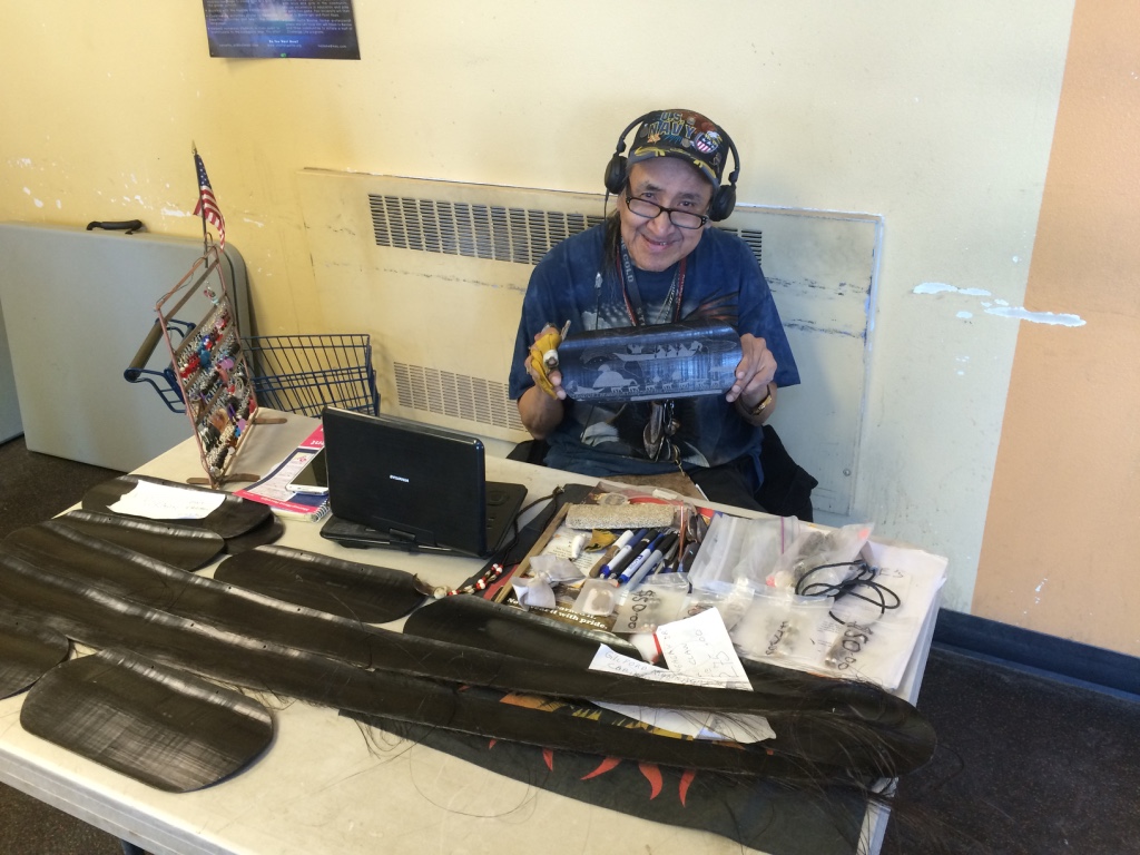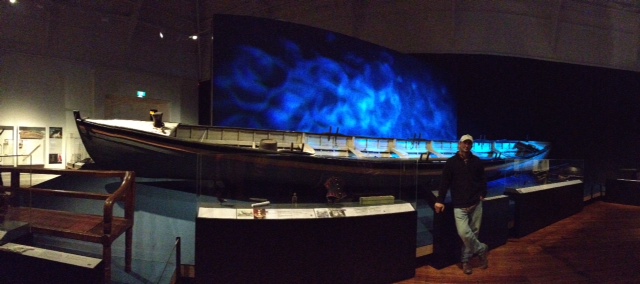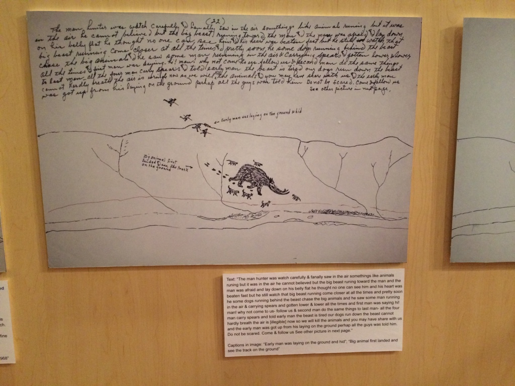 June 27 – Up early to write and catch up on emails. Headed to Ilisagvik College, just a short walk away from the ARF. Eventually, Crissy and the kids joined me. Leslie picked us up and, after a quick stop to see a local sled dog team, dropped us at the Inupiat Heritage Center (IHC). We wanted to look for some gifts and the traditional artist’s room at IHC has always been a great place to connect with Inupiat artists who work with whalebone, baleen, walrus ivory, and mammoth tusk. I bought a whalebone-handled ulu; ulu’s are part of everyone’s tool set here and extremely useful for cutting and butchering. We continued to look for gifts across the street at the AC store, Barrow’s mini-Walmart. Local Inupiat folks sell their wares in the lobby and we had the pleasure to meet Earl Aiken. Earl etches small pieces of baleen with scenes from the “Land of the Midnight Sun” and sells them as souvenirs. I bought two. The kids are still looking for gifts, but we have friends in Point Lay who make lots of things. After the AC, we returned to the IHC to check out the whaling exhibit and to learn about Inupiat life and traditions. This exhibit is one of my favorites and had a new gallery featuring a journal recording the oral history and art of a mammoth hunt.