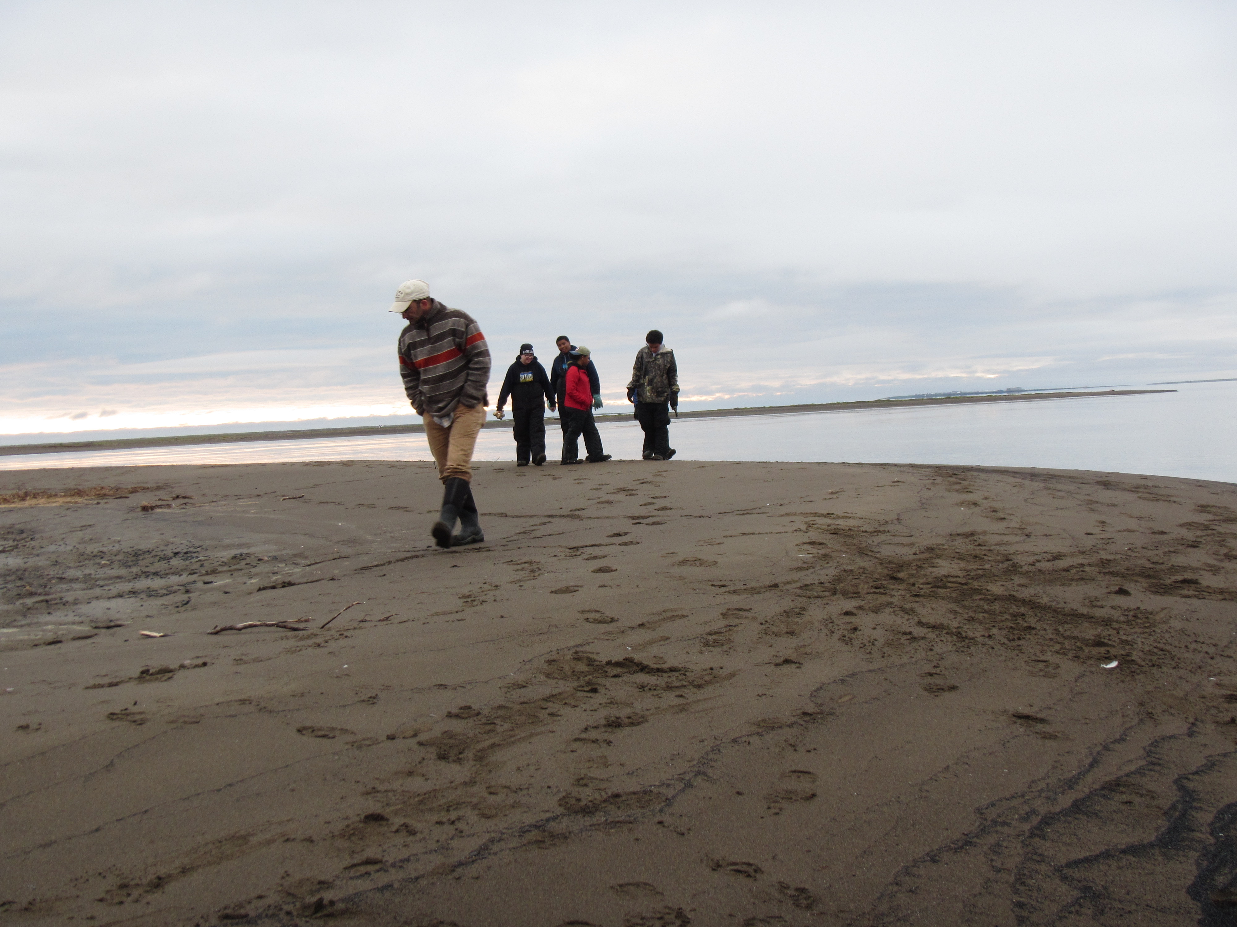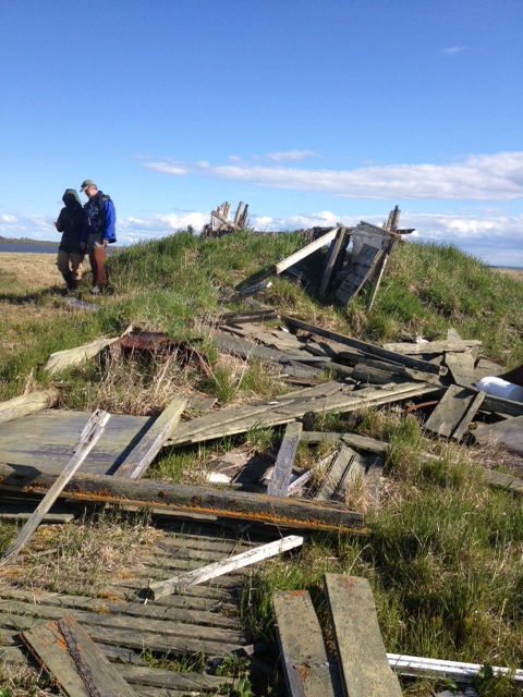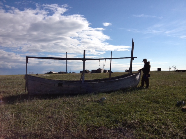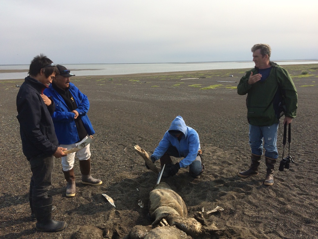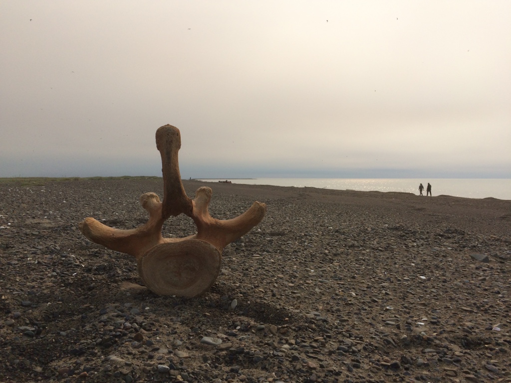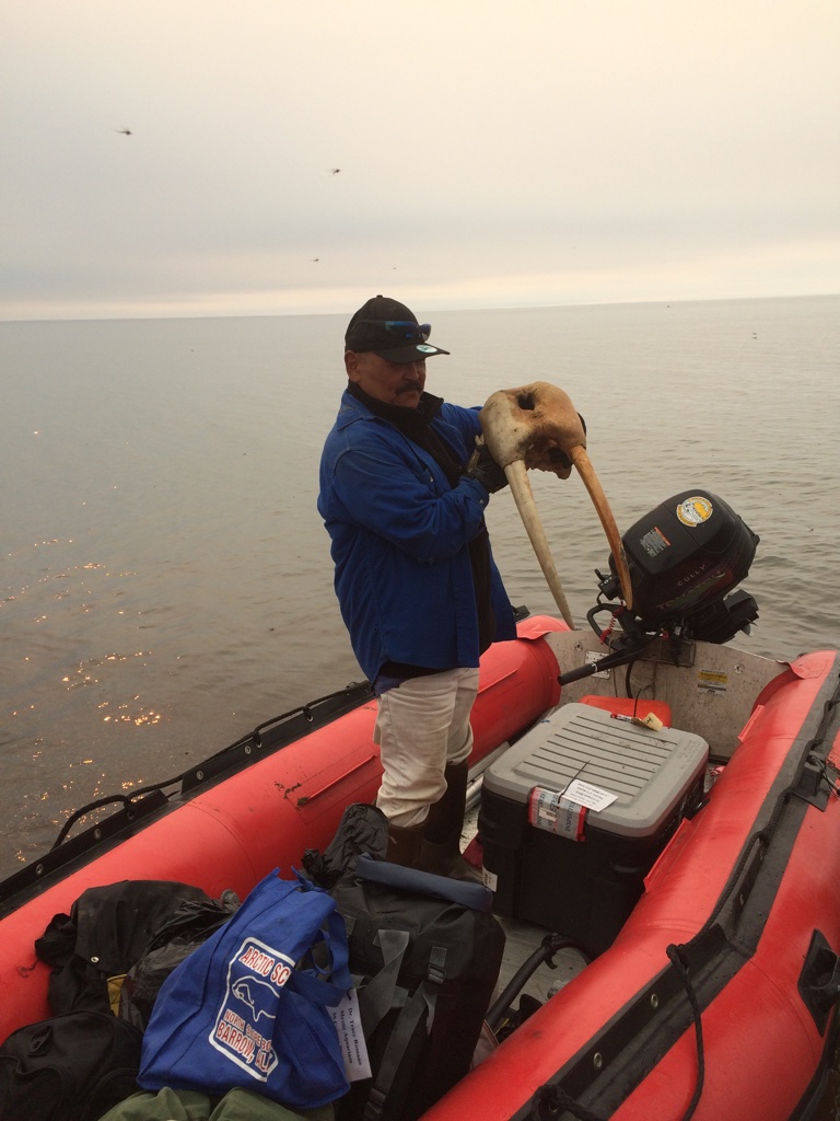 We arrived at 11 Mile Sinogak and watched for signs of beluga activity. Bryan Anniskett took his boat along the shoreline with Leo Ferreira Jr. and Mike. We met, snacked, and then Bryan and crew headed farther north to see if there were beluga they could turn back. We beached all of the zodiacs and waited, watched, beachcombed, and enjoyed the very beautiful arctic environment. When we hit the beach, Jim Jim was off and running. Timothy was not far behind. Jim Jim found some whale vertebra and rib bones that he stuck in the sand so others would know the beach has been combed. He proceeded to find a dead walrus and, as putrified as it was, he worked to remove the tusks, calling it “Eskimo money.” After some time wrangling the tusks (all of us helped), they were finally free. He and Timm kept going. I sat for a bit with the scientists and just watched and listened to Arctic sounds. It’s really amazing to find yourself in a place so remote that it is possible to find no evidence of buildings, cars, trains, planes, boats. Just waves, birds, and wind through the beach grass. After some time, we walked south to the sinogak, beach combing along the way. More whale, walrus, and other bones. At the little spit of land at the end, I found a mammoth tooth! We all convened back at the zodiacs and Robert had to take on to pick up Jim Jim and Patrick and his family. Jim Jim had found two more walruses and made out like a bandit! On our way back we stopped at the beach where an estimated 35,000 walrus hauled out last September. They have been doing this since 2007 and this past year it made international news because of heightened interest in global climate change – lack of ice for them to haul out on. This past year, there was a stampede on the beach and many dozens of walrus died. We stopped to check it out and they were all putrified, tusks removed (post-mortem), and the surrounding stretch of beach was more astroturf-colored grass because of all the walrus scat fertilizer. After this visit, we headed back towards Kali. We found Patrick and family on the beach with a boat motor that blew, so we towed him. As we passed the old village of Kali, we got news that there were three grizzly bears neat the village. At about 10pm, we got to the boat launch, cleaned up, dismantled one zodiac, we took the truck to see if we could find them out near the airport hangar. No sighting…