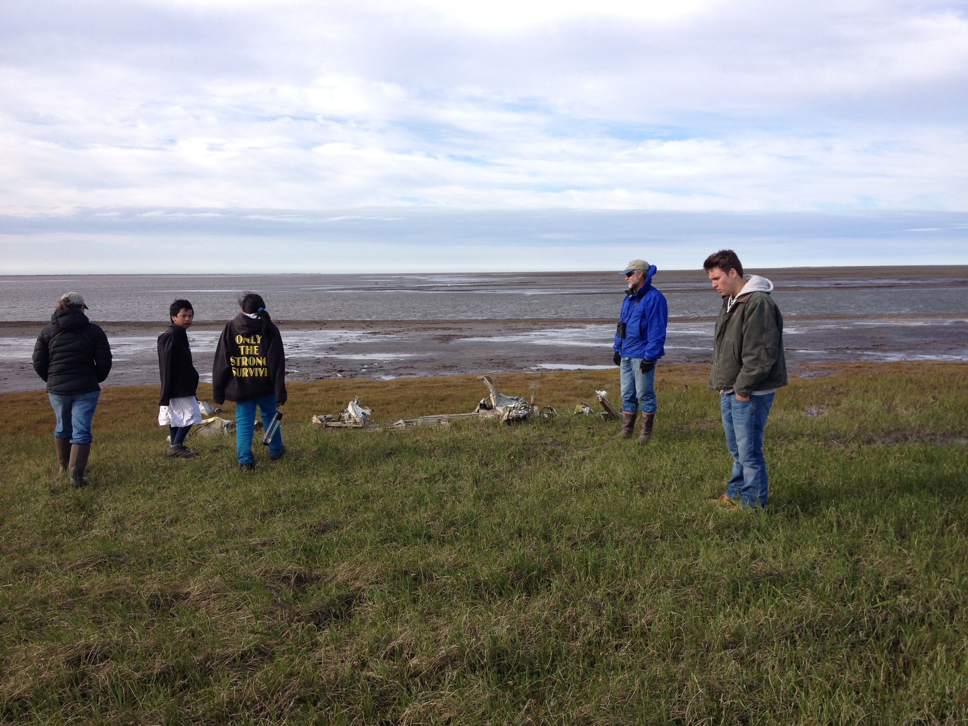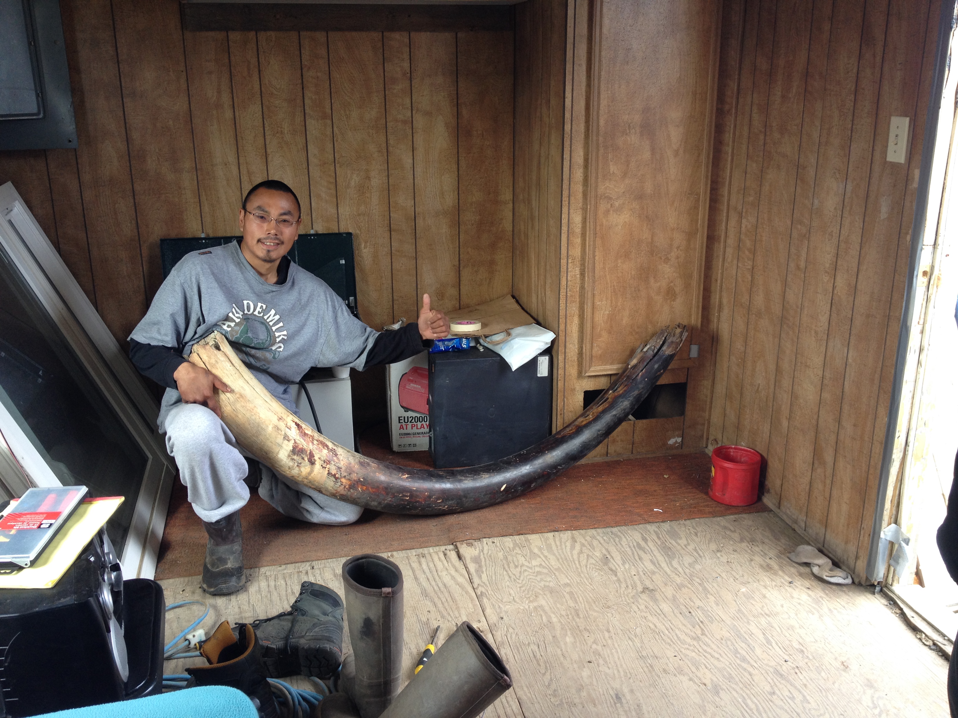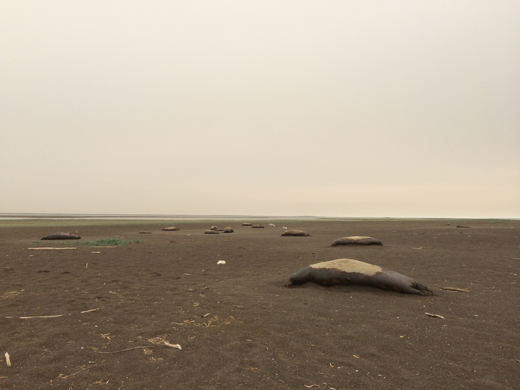 We arrived at 11 Mile Sinogak and watched for signs of beluga activity. Bryan Anniskett took his boat along the shoreline with Leo Ferreira Jr. and Mike. We met, snacked, and then Bryan and crew headed farther north to see if there were beluga they could turn back. We beached all of the zodiacs and waited, watched, beachcombed, and enjoyed the very beautiful arctic environment. When we hit the beach, Jim Jim was off and running. Timothy was not far behind. Jim Jim found some whale vertebra and rib bones that he stuck in the sand so others would know the beach has been combed. He proceeded to find a dead walrus and, as putrified as it was, he worked to remove the tusks, calling it “Eskimo money.” After some time wrangling the tusks (all of us helped), they were finally free. He and Timm kept going. I sat for a bit with the scientists and just watched and listened to Arctic sounds. It’s really amazing to find yourself in a place so remote that it is possible to find no evidence of buildings, cars, trains, planes, boats. Just waves, birds, and wind through the beach grass. After some time, we walked south to the sinogak, beach combing along the way. More whale, walrus, and other bones. At the little spit of land at the end, I found a mammoth tooth! We all convened back at the zodiacs and Robert had to take on to pick up Jim Jim and Patrick and his family. Jim Jim had found two more walruses and made out like a bandit! On our way back we stopped at the beach where an estimated 35,000 walrus hauled out last September. They have been doing this since 2007 and this past year it made international news because of heightened interest in global climate change – lack of ice for them to haul out on. This past year, there was a stampede on the beach and many dozens of walrus died. We stopped to check it out and they were all putrified, tusks removed (post-mortem), and the surrounding stretch of beach was more astroturf-colored grass because of all the walrus scat fertilizer. After this visit, we headed back towards Kali. We found Patrick and family on the beach with a boat motor that blew, so we towed him. As we passed the old village of Kali, we got news that there were three grizzly bears neat the village. At about 10pm, we got to the boat launch, cleaned up, dismantled one zodiac, we took the truck to see if we could find them out near the airport hangar. No sighting…