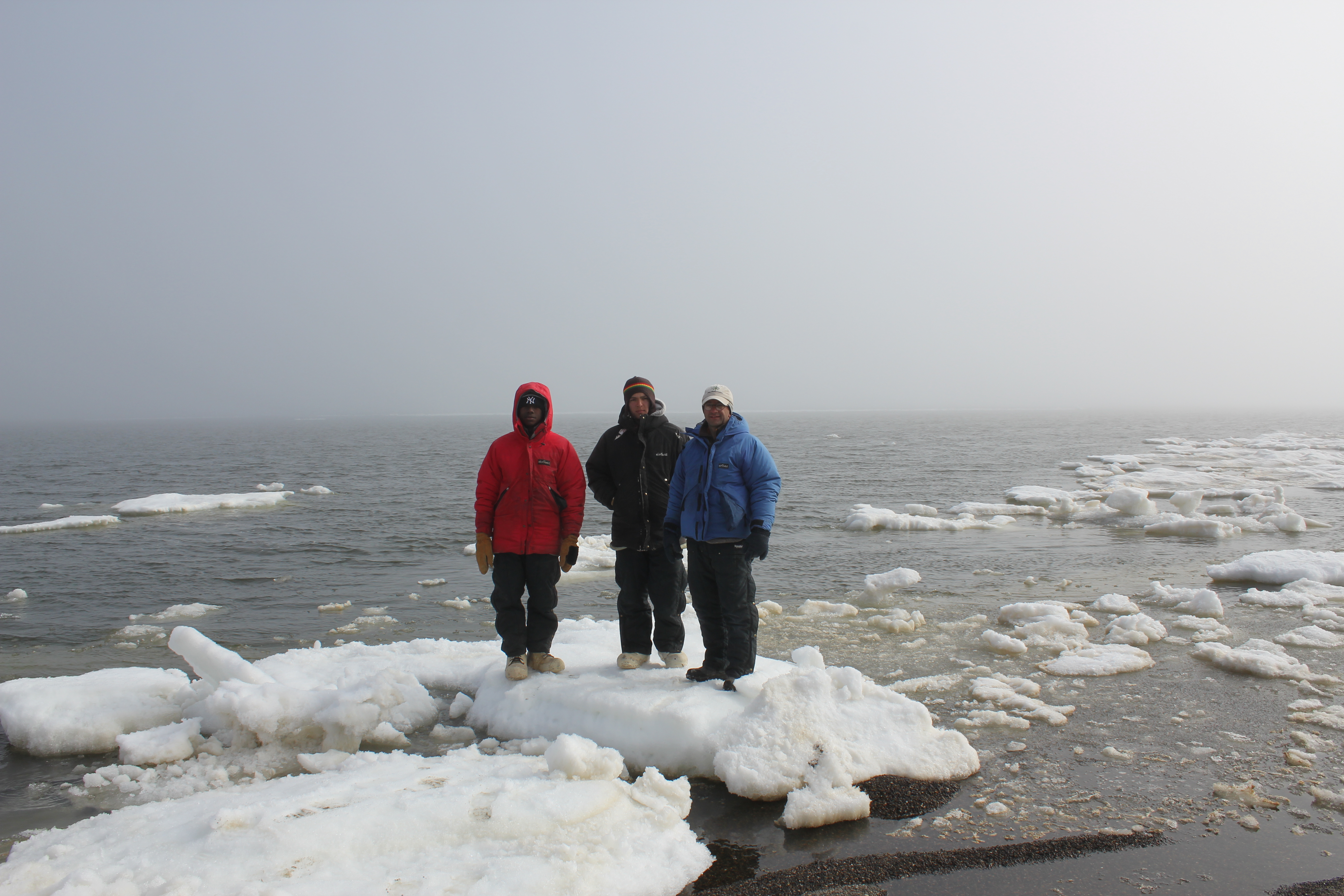 Pequots standing in on ice in the Arctic Ocean. Pondering ways to avoid doing a polar plunge. l-r: Anthony, C.J., D’Vante, Aakyia.