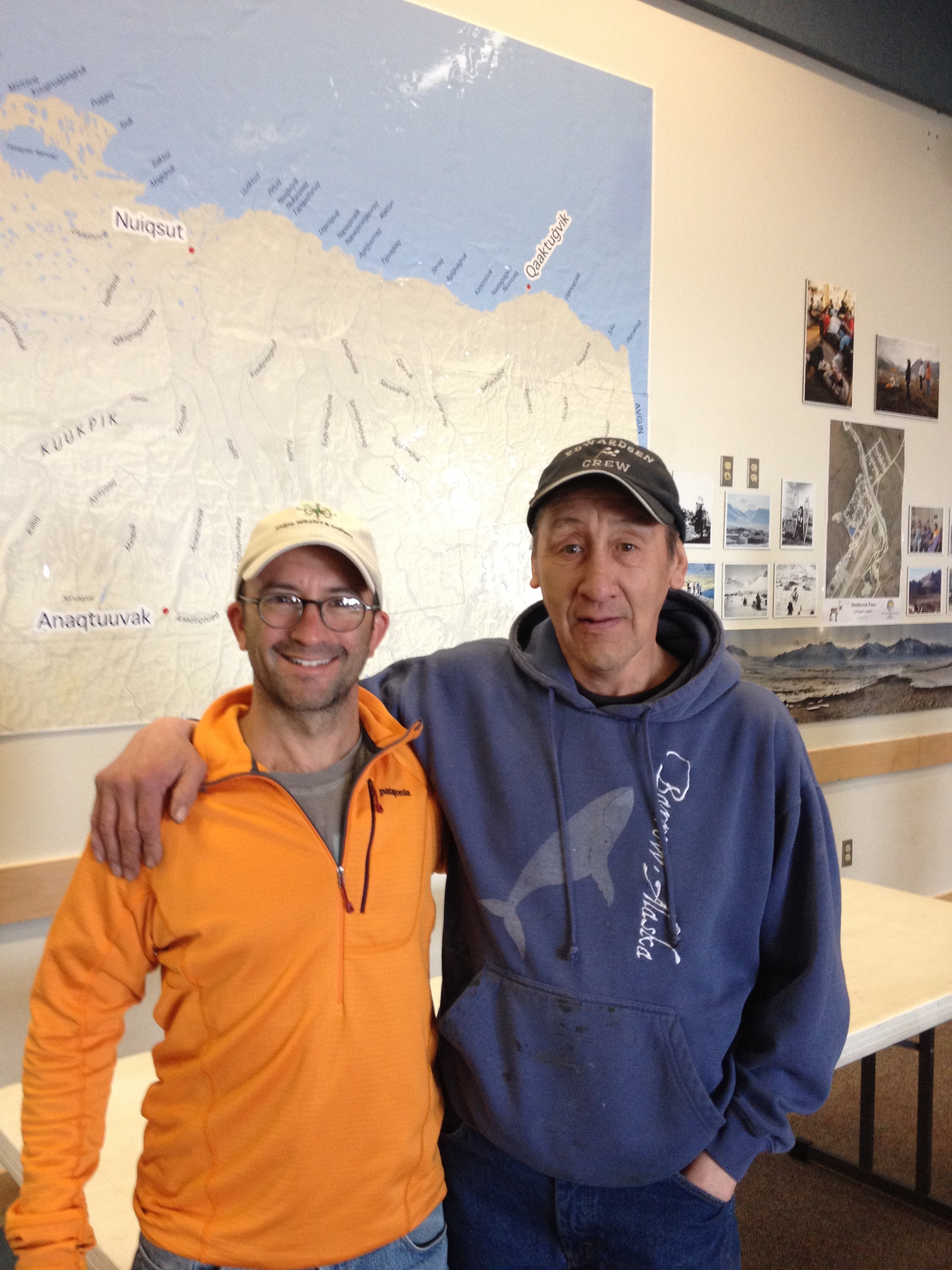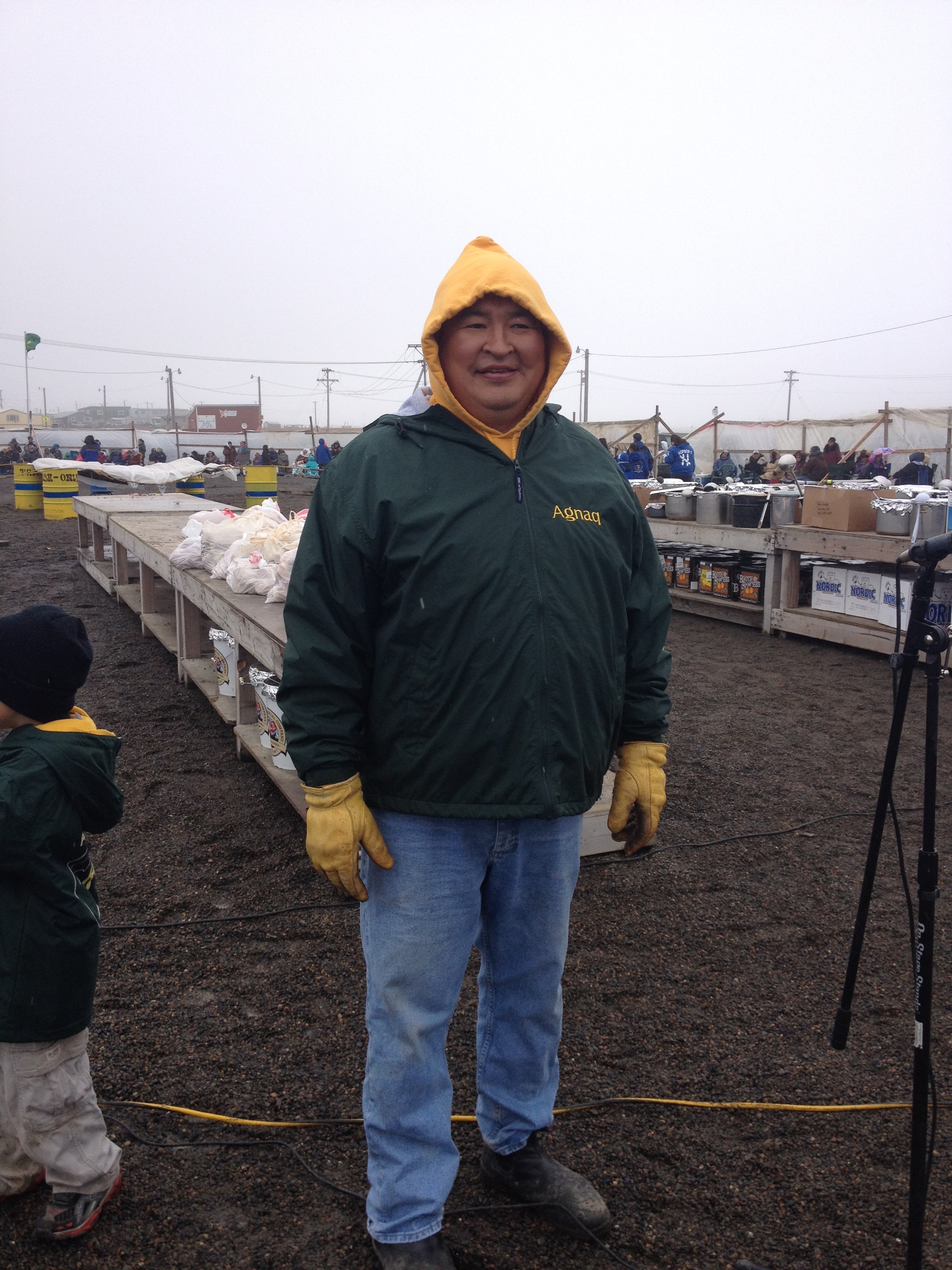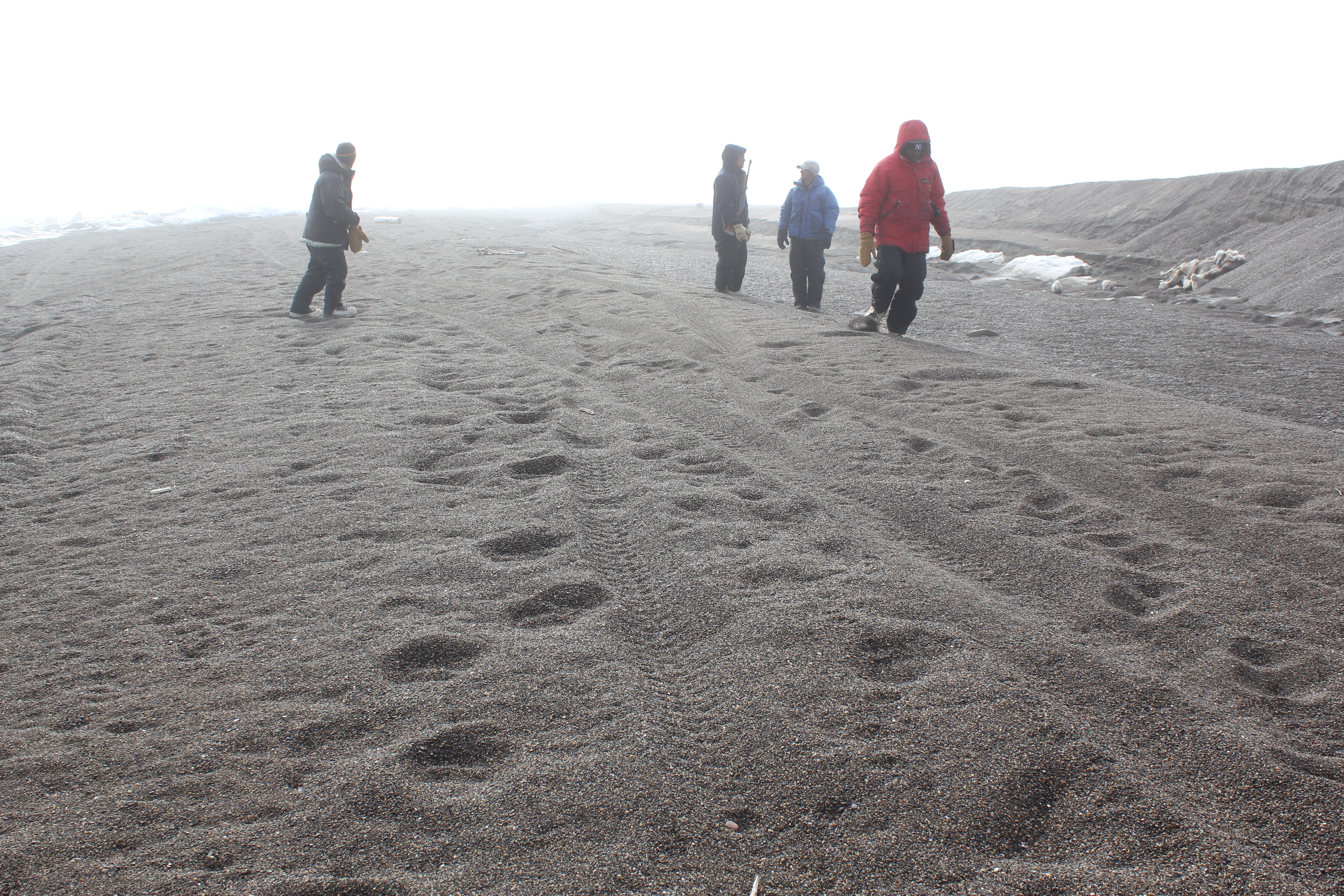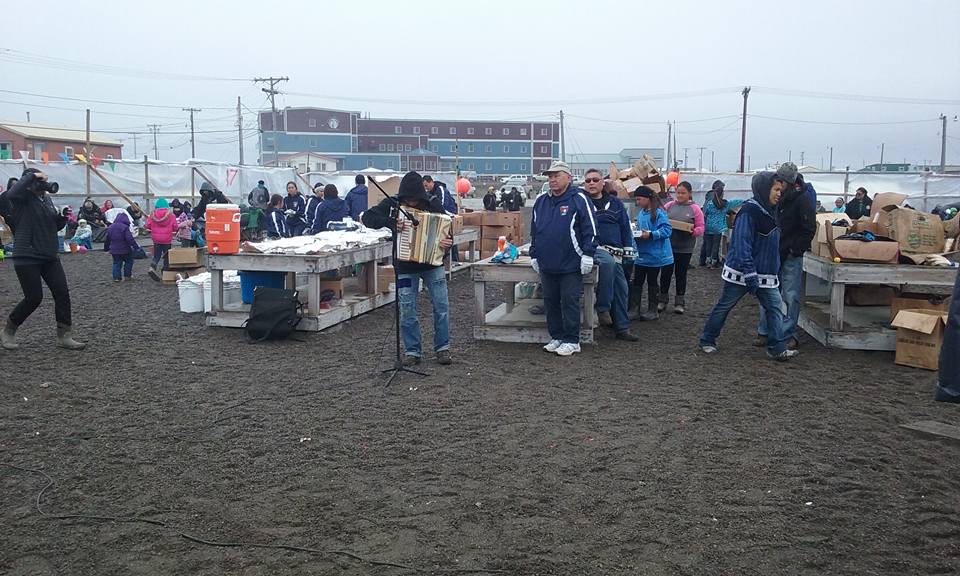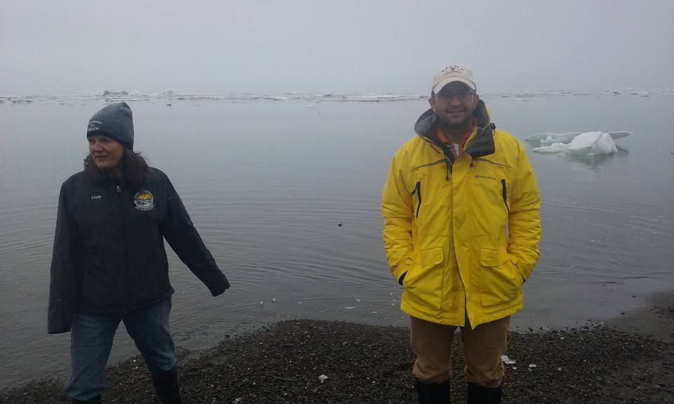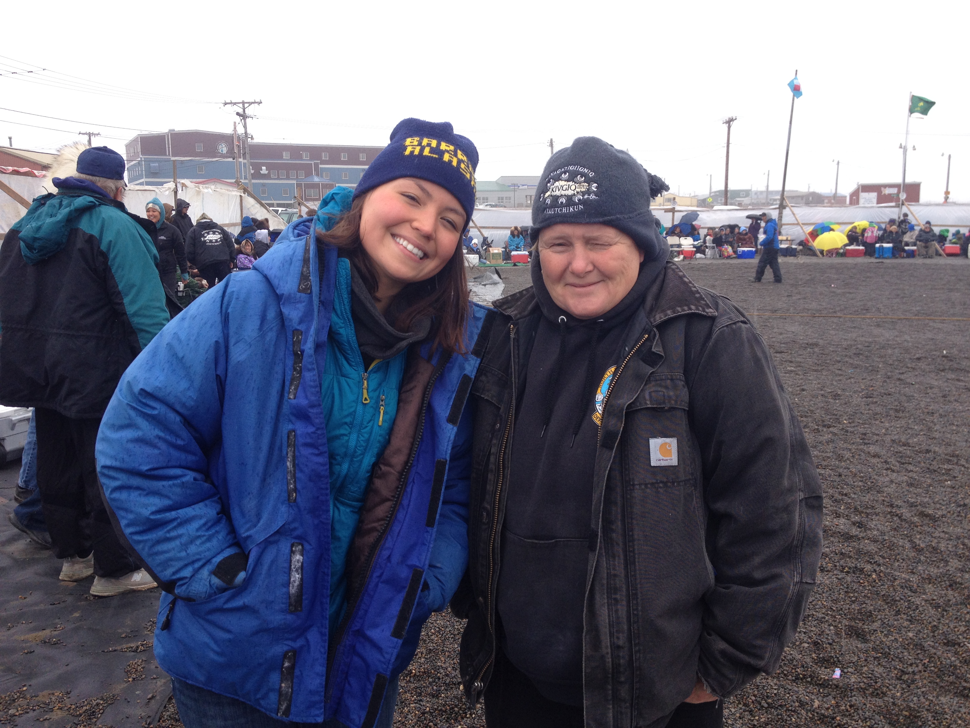 Our friend Leslie Pierce, from the North Slope Borough Department of Wildlife Management, picked us up and brought us to the Arctic Research Facility (ARF) where we dropped our gear, settled into our rooms, and bundled up for Nalukataq. Nalukataq is a whaling thanksgiving, like an Arctic potlatch or give-away ceremony, where successful whaling crews distribute the bounty of their hunt along with other treats like tuttu (caribou) soup, nigliq (white-fronted goose) soup, fresh fruit, mikiaq (fermented whale meat and blood), uuruk (cooked whale meat), and maktak (whale skin and blubber). Nalukataq began at about noon and takes place in a semi-sheltered space about the size of a hockey rink. Today’s event was hosted by two whaling crews, Capt. Eugene Brower’s Aalaak crew and Capt. Gordon Brower’s Ikayuaq crew. We sat in section 12; sections are numbered around the enclosed space to allow the event hosts to direct their crews to make sure that all attendees in all areas are provided for equally (though elder’s are gifted first with some things like akutaq (Eskimo ice cream)). It was cold, and misty to light rain, so we warmed up by walking around and met Inupiat community members including Mayor Charlotte Brower, State Rep. Benny Nageak, and members of the village corporations. We checked out the beach area and sea ice near the old Cape Smythe Whaling Station. After the distribution ended, we took our cooler full of whale meat back to the ARF and repackaged it for transport to Connecticut.