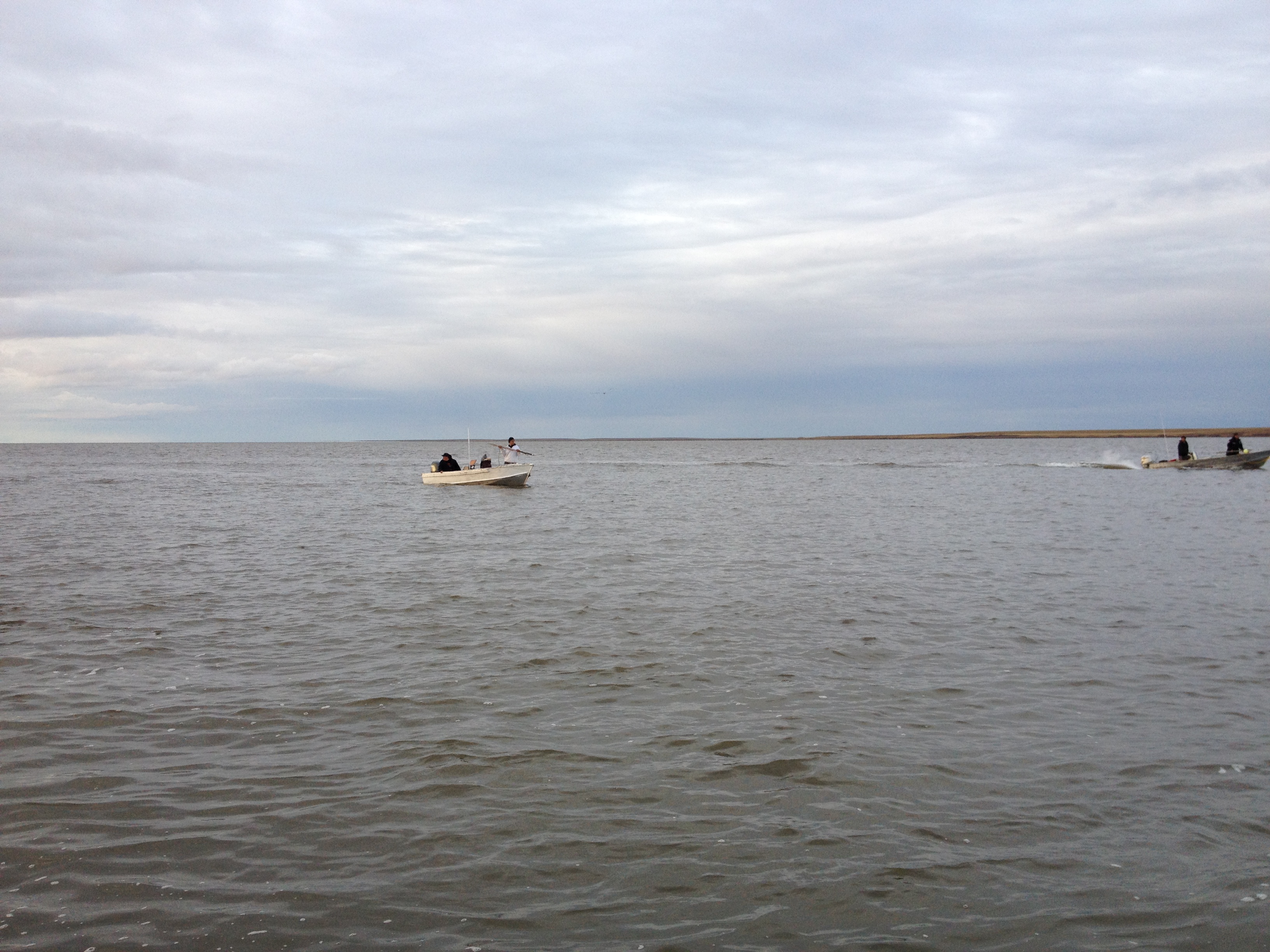 July 2 – Wind beginning to lay down and expected to continue to getting calmer. Relaxed and caught up on work and emails most of the day. Preparing for the village council meeting in the evening. After dinner, we headed over to the community building for the council meeting. About twenty-five people were present. Leo presided over the meeting agenda and an organized and respectful discussion of issues and concerns followed. At every point, it was clear that attendees were interested in knowing how things would be for the benefit of the village. Robert and Greg were able to update the village on research related issues and towards the end of the meeting, I presented information and a plan for research that Tracy Romano and I have relating to the social networks associated the harvest and distribution of beluga meat and maktaaq. The council will deliberate about this later and when they have some more detail from Tracy and I. The meeting adjourned at 9:37pm. We all headed back to the school for a relatively quick dinner and then prepared for a late night on the ocean looking for beluga. We were at the boat launch by 11pm and soon after in the Arctic. We headed across the lagoon to pick up the gear on the barrier island and then through Kali Pass. No beluga. Then south inside the lagoon to 5 Mile Pass and beached the zodiacs. We did spot some belugas and kept an eye on them with binoculars. We radioed to town with hopes to have extra boats help drive beluga into the lagoon for tagging. We waited for about an hour watching and beach combing (i found some more amber). Eventually Patrick arrived and we headed out. Belugas were no longer visible so we headed south and then a drive north to push any that we could not see. Still nothing. On our drive north we did see gray whales – female and calf – at a distance. Headed in at 4:30am and exhausted.