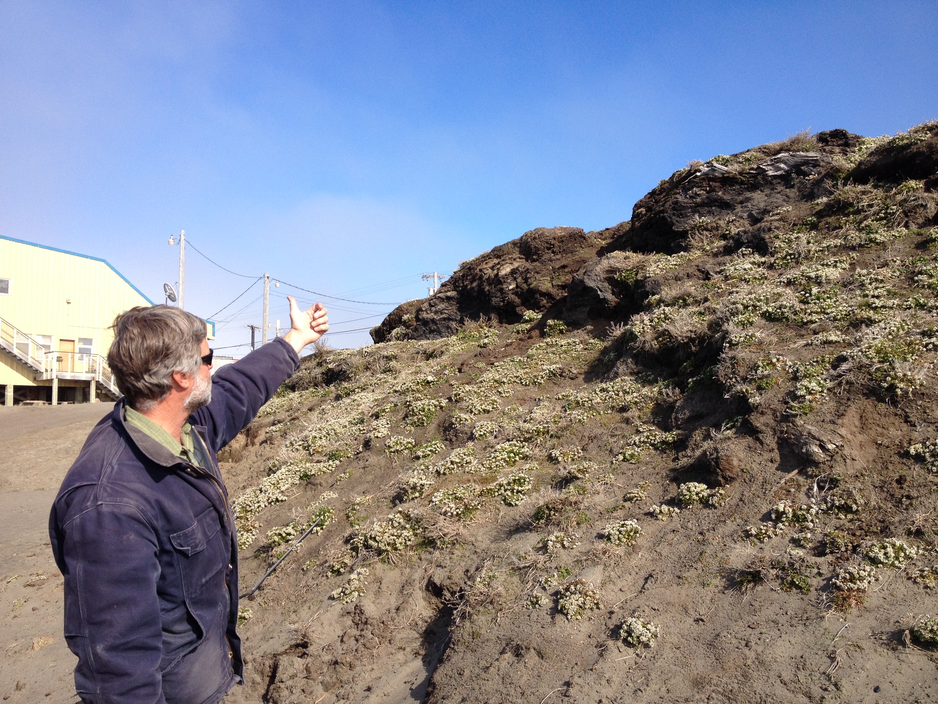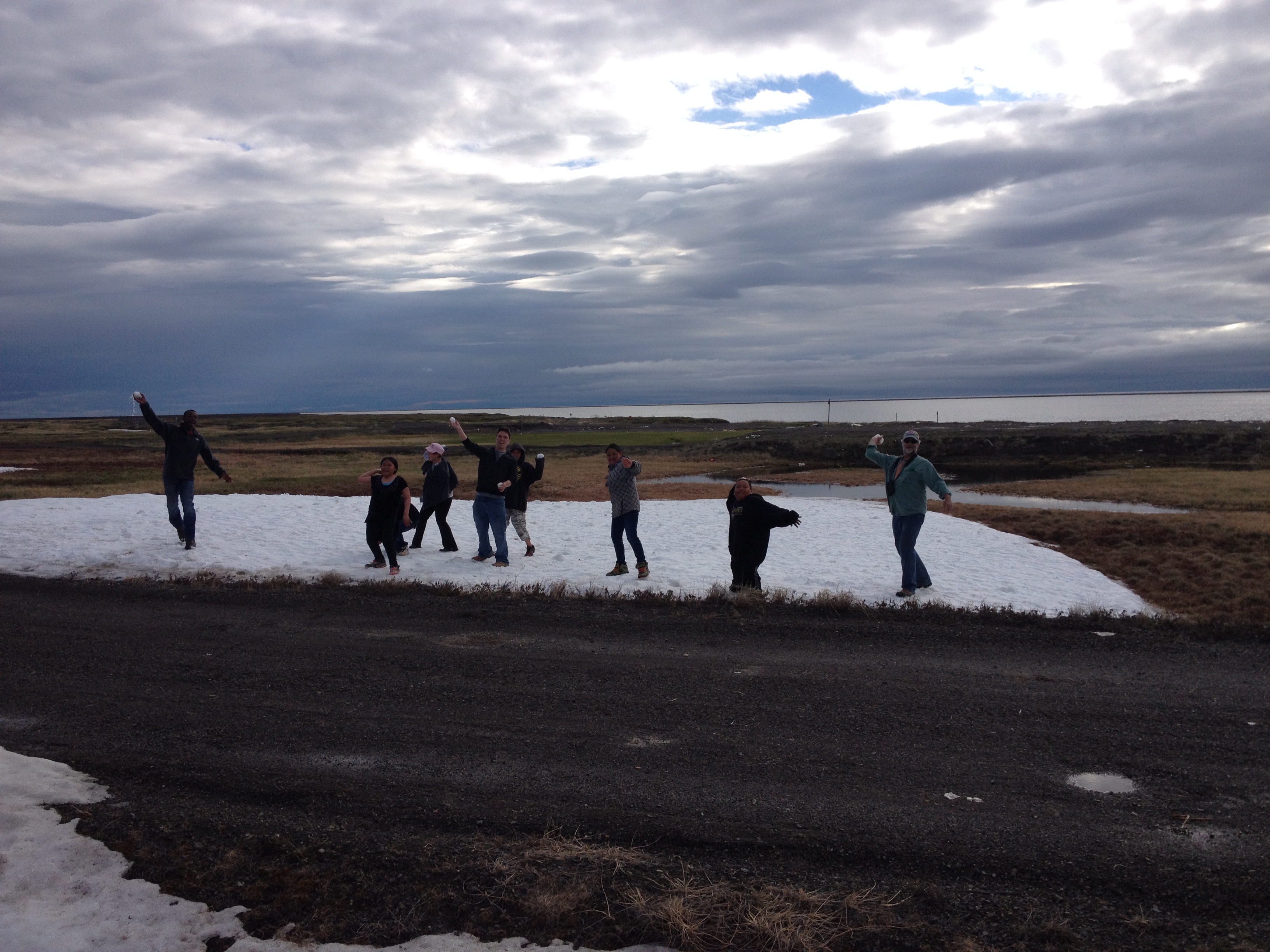 June 29 – Blustery day and mid-40’s. Slow start and waiting for word if we would head across the lagoon to conduct some sampling of the 50 or so beluga whales that were harvested by the community on June 21st. Still choppy on the water, so we had breakfast, relaxed for a while and played a dice game called farcle, and then went for a walk. Some of the village kids followed us and we eventually ran into Robert Lisbourne. Robert showed us the mammoth tusk he found in the tundra last year and then we asked if we could see his father’s ice cellar. His dad, Julius Rexford, is one of the village whaling captains and the ice cellar are used to store larger shares of whale meat and maktak. The cellar was dug into the permafrost at a depth of about ten feet by using large augers. The lower five feet was expanding horizontally by hand chopping so was about eight feet in diameter. Inside the ice cellar there was a leak that had formed a very large icicle, with water pooled below in a plastic tub. We helped Robert haul out the ice and water by using a 5 gallon bucket with a handle tied to a rope. After visiting Robert, we headed to the boat launch and back to Kali school for lunch. Heard that we would hold off on our visit to the barrier island until the winds died down so we relaxed for a while. I took a nap and nearly missed dinner. After dinner, some of us went for a walk to the old Air Force hangar and “raven tower” where the ravens nest. Willard Neakok, Leslie Stalker, and a group of village kids joined us. We chatted along the way, threw and/or were hit with snowballs, and went beach combing. Along the beach we found a dead beluga and took a sample for genetic testing. The boys were throwing rocks in the pools of water, finding bird’s nests, and racing off on their bikes. When we got back the the school, we continued a rousing game of farcle and the Pequot students had finally connected up with their Kalimiut counterparts for the cultural exchange. As I close out this entry at 1am, they are all outside playing basketball.