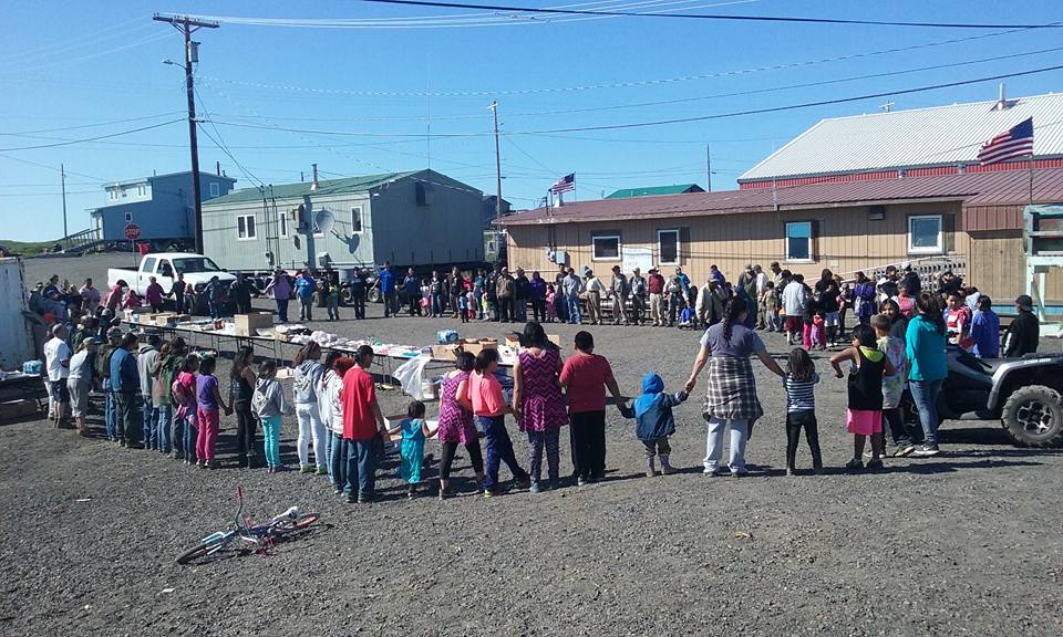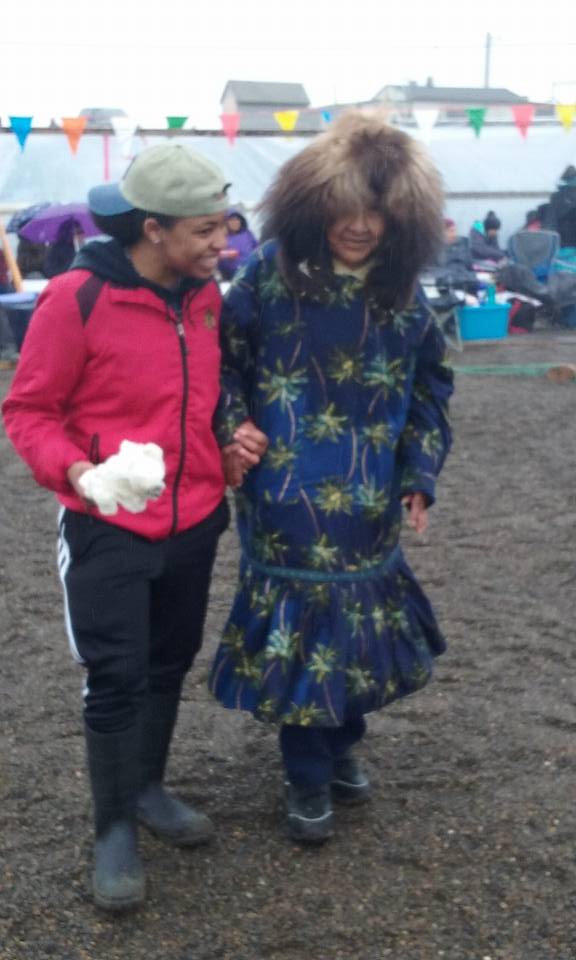 July 4 – I woke up feeling much better and well rested. The most common greeting today: Happy 4th of July! Along with Bill Tracy, we all spent the latter part of the morning cutting lettuce, tomatoes, shucking and boiling corn, and boiling chicken in preparation for the day’s festivities. By the about noon, we had shifted to the community center, setting up and lighting grills. We would soon be cooking for about 250 people! Burgers, hotdogs, egg salad, pasta salad, fruits, fancy cakes, and more. In the midst of this, many of the games and races were under way. Various running races by age category were organized. I ran and won my category (challenging to do in knee high muck boots!). Donna and I were asked to be judges for the Eskimo donut contest, so got to sample seven different donuts. Once the grilling was done, the community gathered around the tables, everyone took their hats off, and one of the elders said a prayer. Then we feasted! After the food vanished, there was a short break and then Eskimo dancing began. We watched wonderful and varied dances that many of the Kali participated in either as drummers, dancers, or both. Near the end, the students, myself, Robert, Tracy, Donna, Greg, and Leslie and other guests joined in the dancing. Then we taught the Kalimuit the round dance, something they all enjoyed doing. We helped clean up, then to the school. The students, Crissy, and I went to the shootout competition at the boat launch. The others stayed in and played farcle and to rest. We didn’t stay too long at the shootout and then headed back to the school. The movie tonight: Little Miss Sunshine. Nothing better for a good laugh.