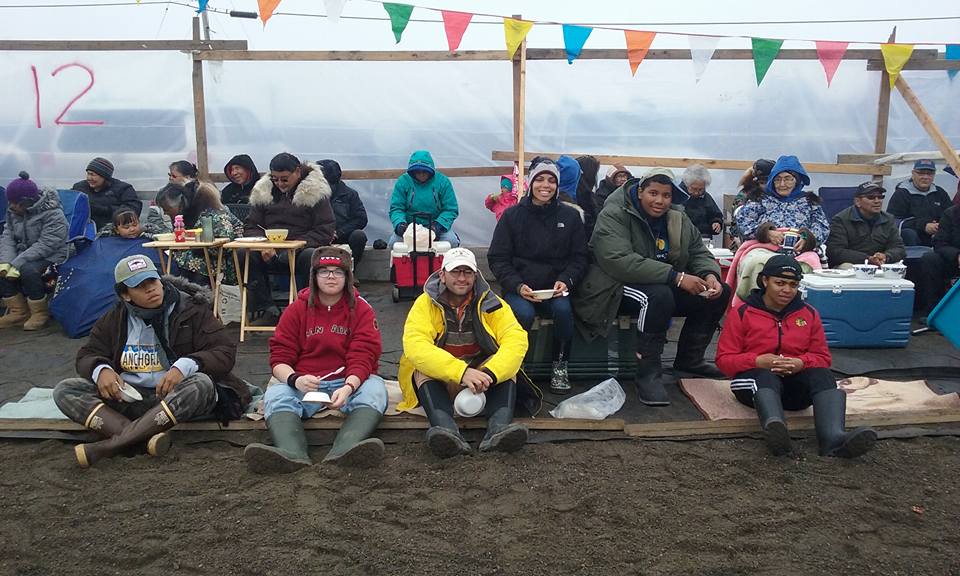 Nalukataq, Section 12. l-r: D’Vante, Anthony, Jason, Crissy, C.J., Aakyia. Waiting for tuttu (caribou) soup.