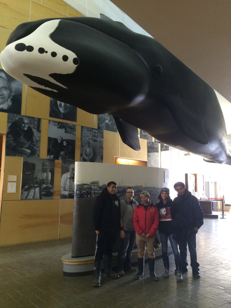 Touring exhibits at the Inupiat Heritage Center. Standing under a replica of a medium sized (35 foot) bowhead whale. l-r: C.J., Anthony, Aakyia, Crissy, D’Vante.