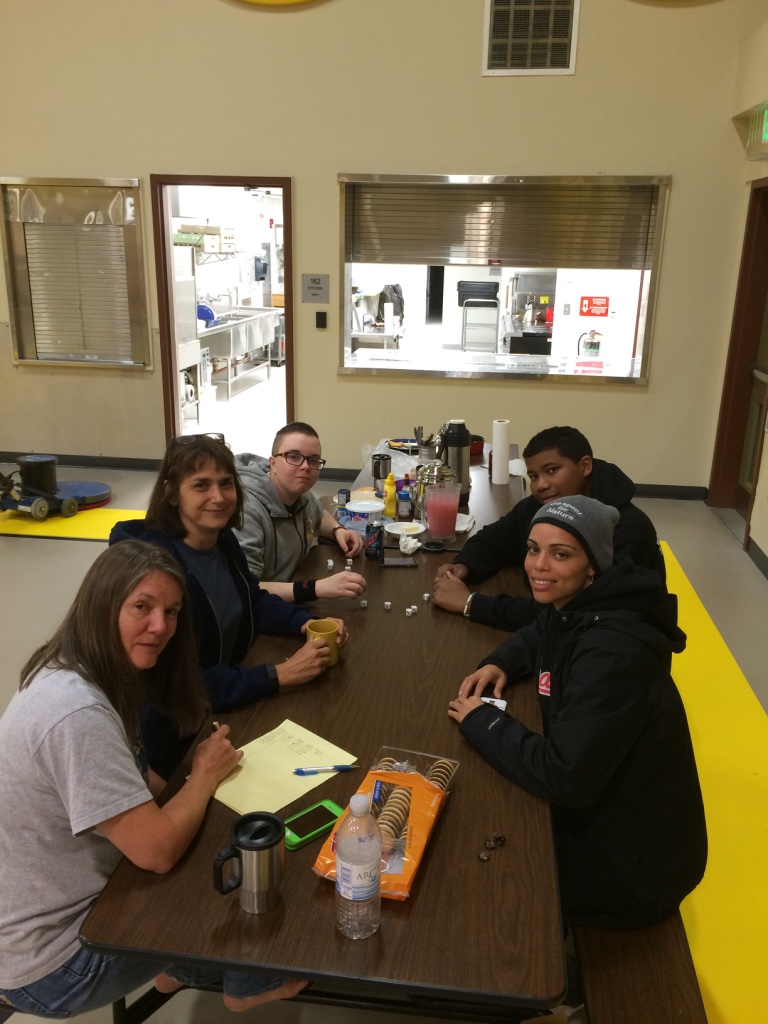 Playing an aggressive game of farcle! Clockwise from bottom left: Leslie, Tracy Romano, Anthony, C.J., Crissy
