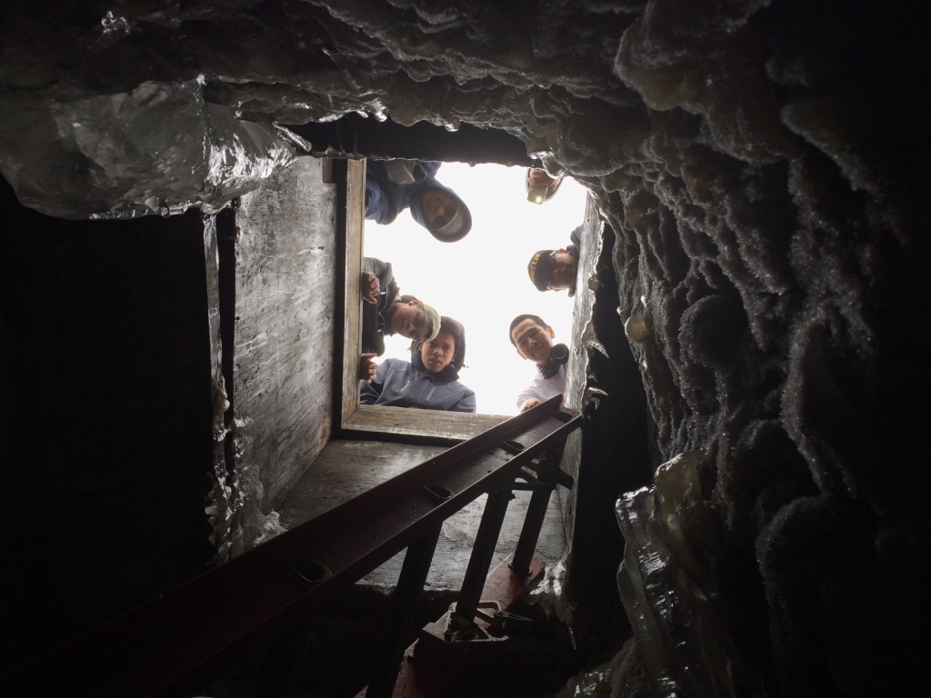 Robert Lisbourne chopping at a large icicle in the ice cellar.