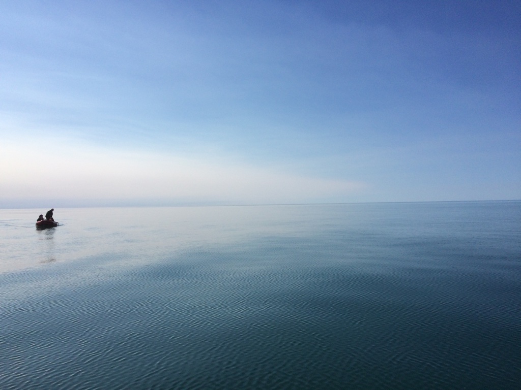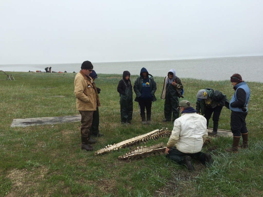 July 5 – Slept in till 11am. My time is more in line with Kali time now. Slow start to the day and around the breakfast table, beginning to discuss how the Cultural Exchange went this year and how we might add or change things to build in more structure to the program. Also that we need to start packing and cleaning for our departure tomorrow. Just as we began to settle in to the days plans, we got word that sisuaq (beluga) were spotted at Kali Sinogak (or Pass – I learned a new Inupiat word today). We all raced to get our gear together and down to the boat launch by about 2:30pm. It was about 75F and no wind in Point Lay today and REALLY bad mosquitos! Timm Ferreira and Jim Jim Tazruk joined us as we headed out through Kali and north towards 11 Mile Sinogak. I was in a zodiac with Timm, Jim Jim, and D’Vante and Jim Jim was anxious to get out so we were out in front looking for beluga. The ocean was really calm and we were a ways out. Saw some interesting linear currents off in the distance and Jim Jim said they were whale wakes. About 10 minutes later we spotted a gray whale and two bowhead whales (mother and calf). Lots of water fowl, but no beluga!