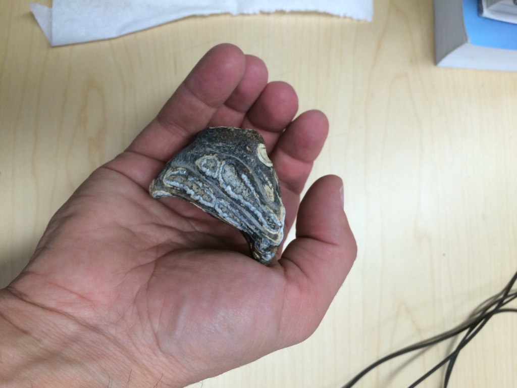 Once everyone was up and had eaten we headed to the boat launch at about 1pm to load up and head across the lagoon. It was cooler, about 40 degrees F and breezy – 15 knot winds, so no mosquitos. The goal today was to take tissue samples from each of the beluga whales that had been harvested on June 21. This was for genetic testing to help develop a better understanding of the long term population dynamics and behaviors of belugas from this area. The cooler temperatures and wind also kept the smell more manageable. Kyia get a little wet on the way over and the other Pequots were getting cold so Crissy took them for a walk to the old Point Lay village sites to warm up. They saw house foundations and abandoned ice cellars, found bear bones, and the beluga bone pile from past year’s harvests. Once we had finished sampling we brought the Pequot back across the lagoon so they could warm up at the school and I went with the science crew to Kali inlet to look for belugas that might be in the area and that might be subjects for tagging. No belugas, but we did some bird watching and beach combing. I was looking for amber on the beach. Towards the end of our time on the barrier island, I found an area with lots of naturally occurring coal. Where there’s coal, there’s often amber. I found a couple of small pieces.