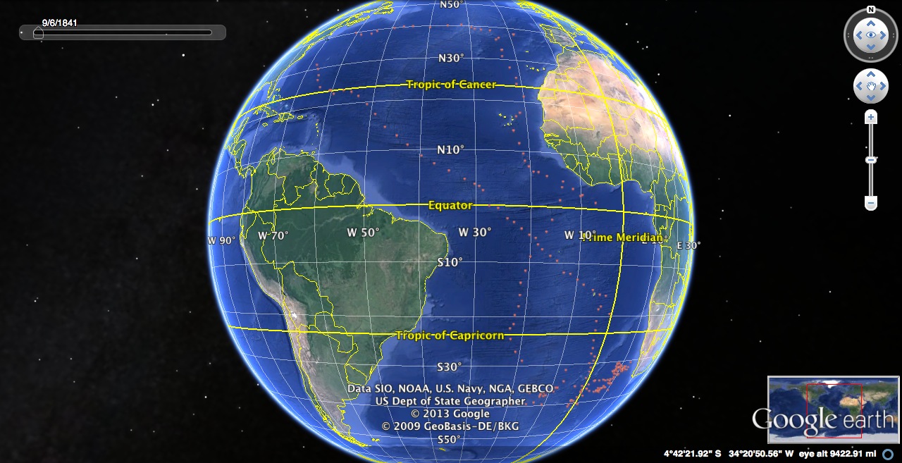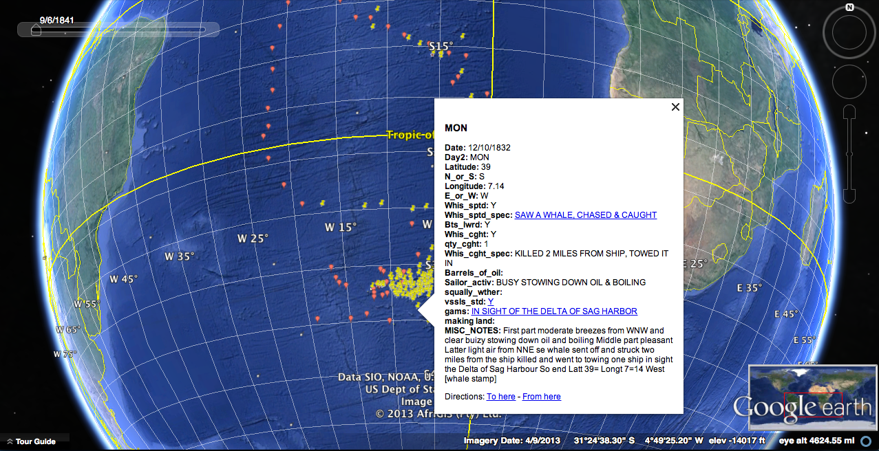 Map 3: This is a partial view of a composite map of the voyages above. Each pin along the voyage route contains valuable information that can be accessed by clicking. The information box in the map below illustrates what occurred on a particular day for one of the voyages as recorded in the logbook.